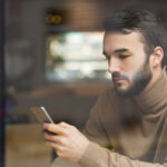 Mão de um homem branco segura um celular e desliza o touch da tela. Ao fundo, sua blusa marrom aparece desfocada.